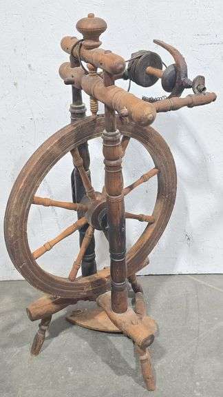 The spinning wheel has a few broken pieces but appears to be mostly complete.