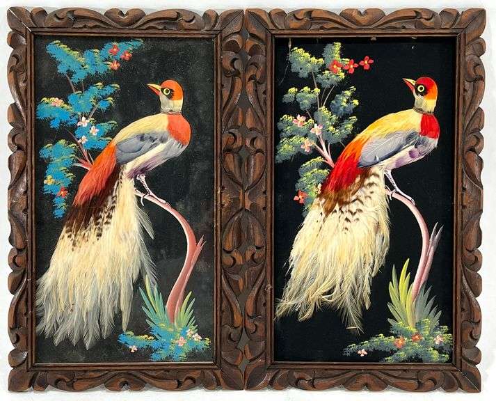 LOT 2091 - Pair of Vintage Framed Mexican Feathercraft Bird Folk Artwork