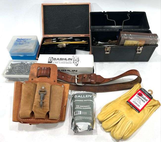 LOT 2143 - Assortment of Tools - Gun Cleaning / Sharpening Kits / Nails / XXL Leather Gloves / Utility Belts